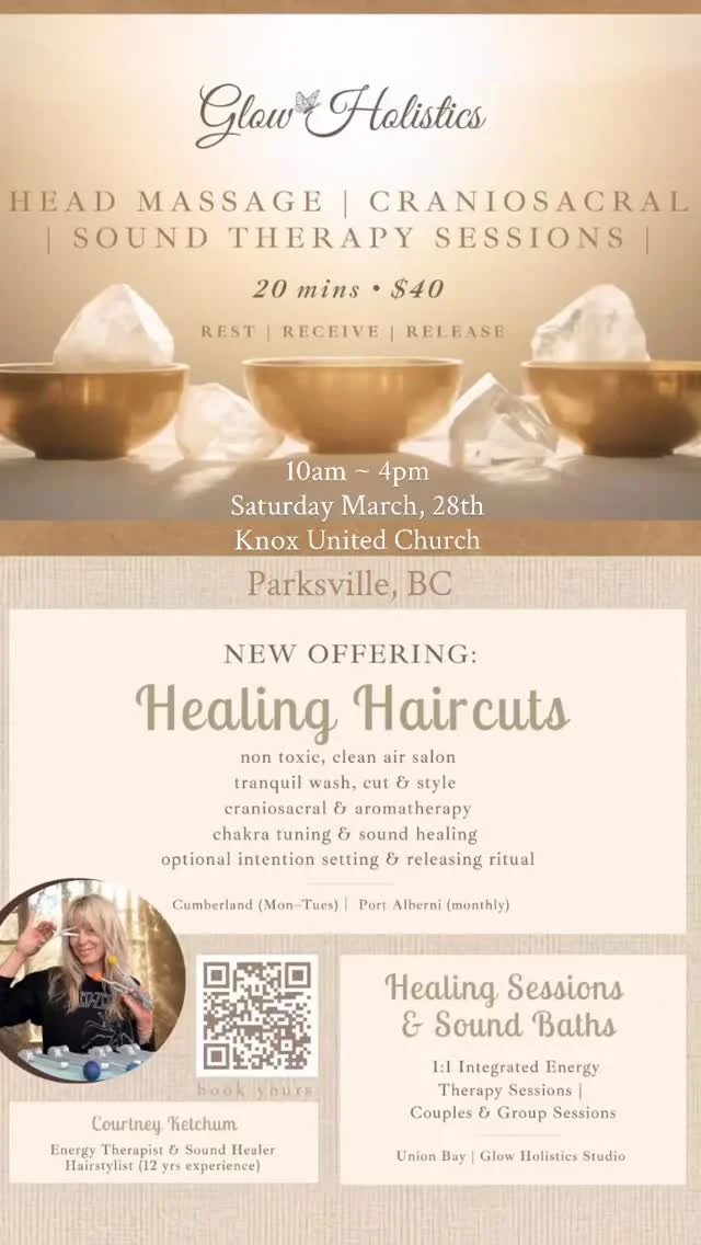 I am Integrated Energy Therapist, Holistic Nutritionist and Sound Healer located in K'Γ³moks First Nations / Comox Valley. I offer a variety of services including body work, sound baths and Healing Haircuts. All are uniquely blended with intention, energy and sound therapy. Every session is an alchemical experience in honour of your desired outcome whether itβs deep relaxation, restoration or a fresh start.